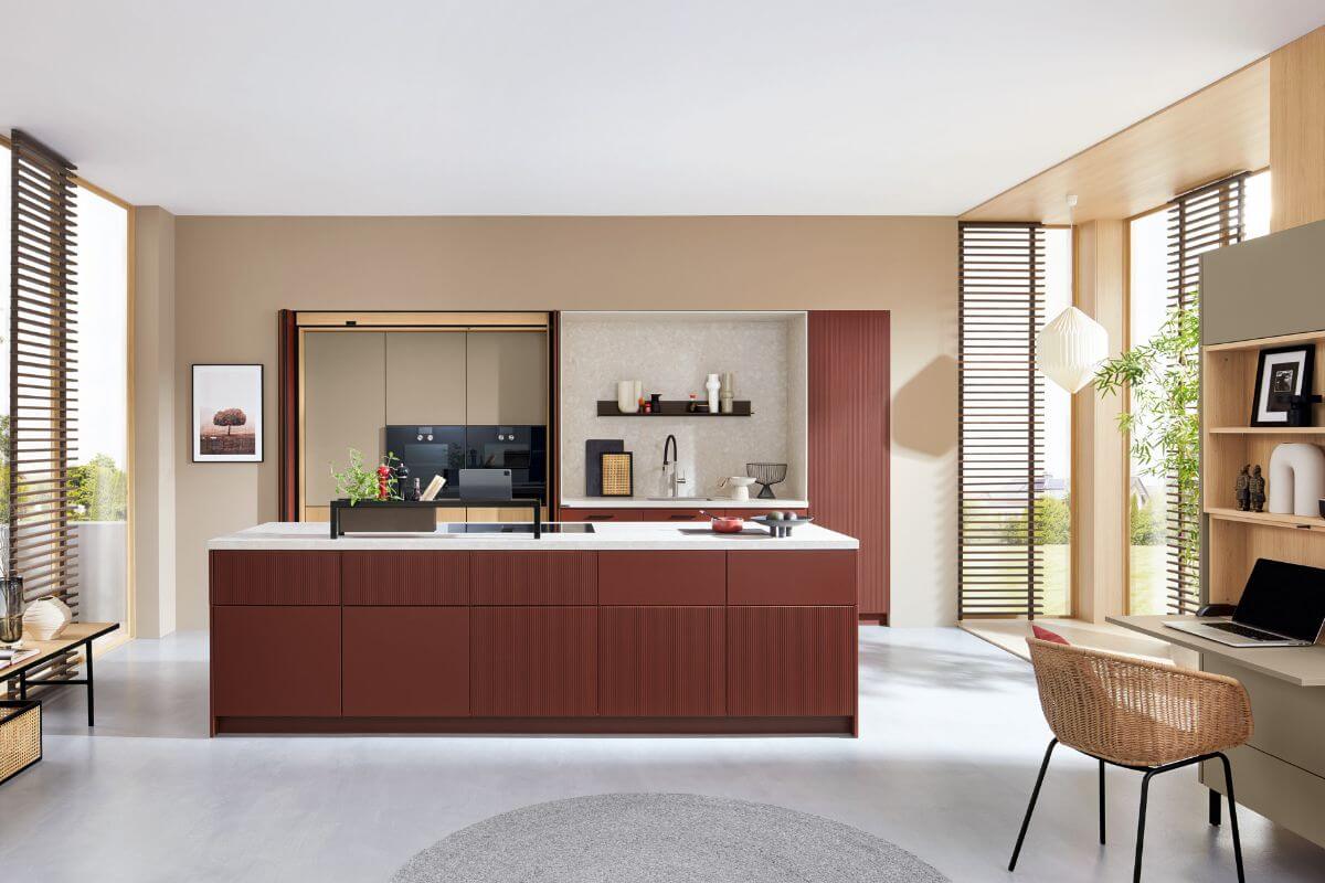 Hinter der Insel erstreckt sich ein großflächiger Küchenwandschrank, der mit burgunderroten Falttüren ausgestattet ist. Diese lassen sich spielend leicht verschieben und fügen sich seitlich nahezu unsichtbar in die Schrankfront ein. Damit entsteht eine durchgängige Fläche, die die ruhige Gestaltung der Küche unterstützt und zugleich viel Stauraum bietet. Backofen und Mikrowelle sind hier auf ergonomischer Höhe integriert, sodass Bücken der Vergangenheit angehört.
