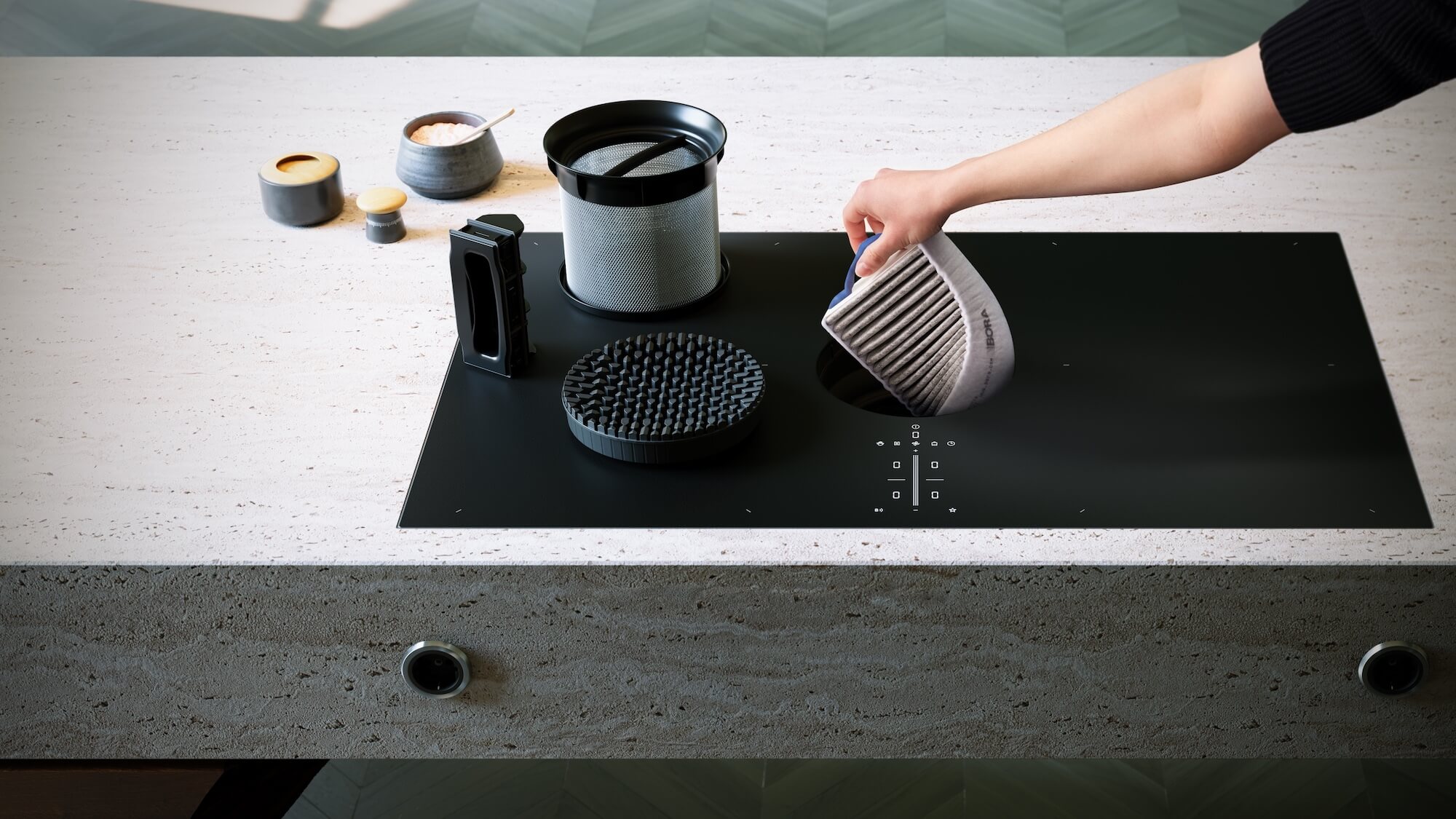 Ein zentraler Punkt der Bora-Neuheiten 2026 ist die Überarbeitung der Aktivkohlefilter. Die neuen Filter verfügen über eine deutlich vergrößerte Oberfläche von rund 4.500 Quadratzentimetern. Dadurch kann mehr Luft gleichzeitig gefiltert werden, sodass die Geruchsbindung spürbar verbessert wird. Ergänzt wird das System durch eine spezielle Beschichtung, die vor allem intensive Gerüche wie Fisch oder stark gewürzte Speisen neutralisiert.