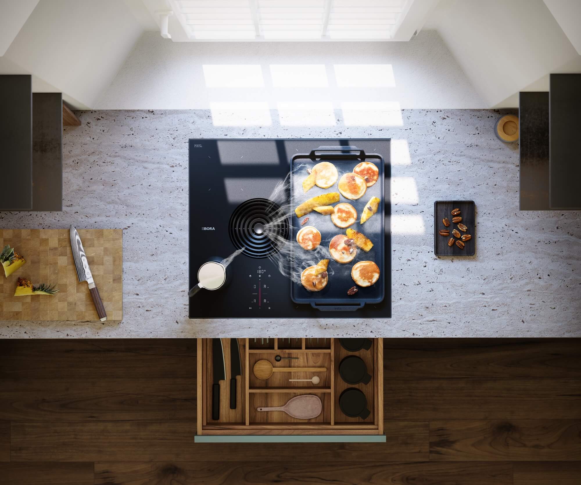 Neben den größeren Kochfeldabzügen erweitert Bora das Sortiment mit dem S Pure. Mit einer Breite von 58 Zentimetern eignet sich dieses Modell vor allem für kleinere Küchen oder Kochinseln mit begrenztem Platzangebot. Trotz der kompakten Maße verfügt das Kochfeld über Flächeninduktion mit Brückenfunktion. Sie können zwei Zonen miteinander verbinden und so auch größere Pfannen oder Bräter nutzen.